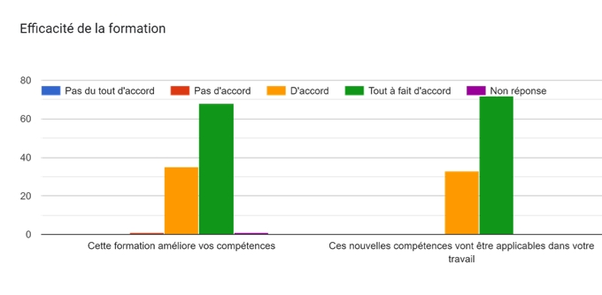 Les commentaires positifs portent notamment sur l'adaptation des outils ce qui nous conforte dans notre approche pédagogique. En effet, nous évaluons les besoins de nos clients et les points d'effort ce qui nous permet d'orienter nos ateliers sur une construction partagée d'outils qui donnent du sens à la formation et permet un gain de temps pour l'encadrement.